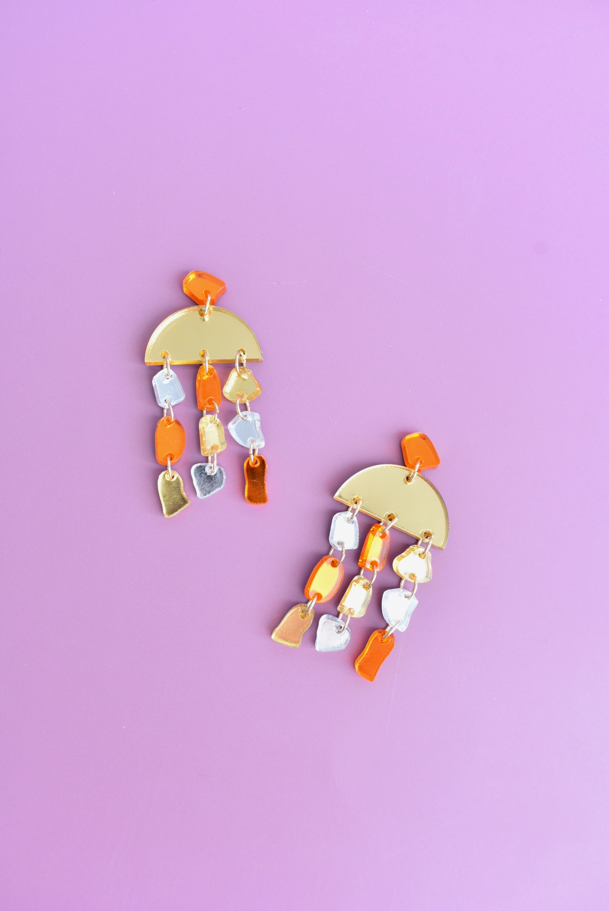Fall neutrals statement earrings with an amber metallic stud with shades of gold and silver dangles.